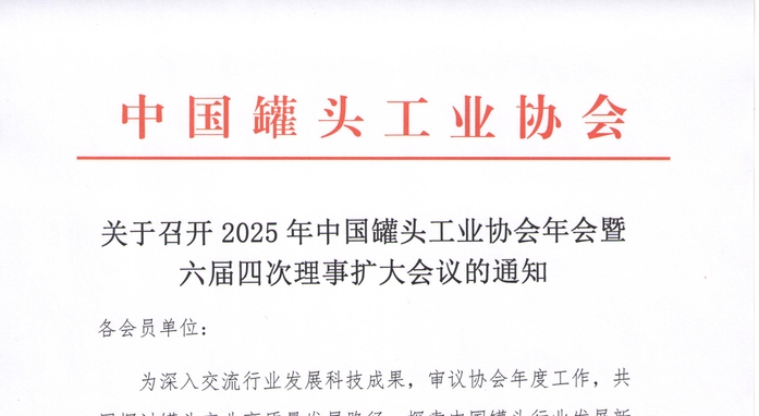 • 关于召开2025年中国罐头工业协会年会暨六届四次理事扩大会议的通知